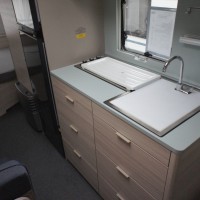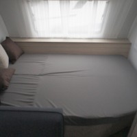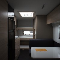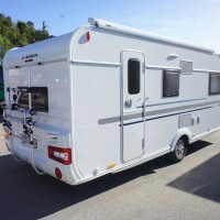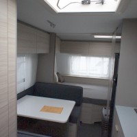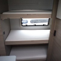 Der Familienwohnwagen mit 3fach Stockbetten und Rundsitzgruppe Front.